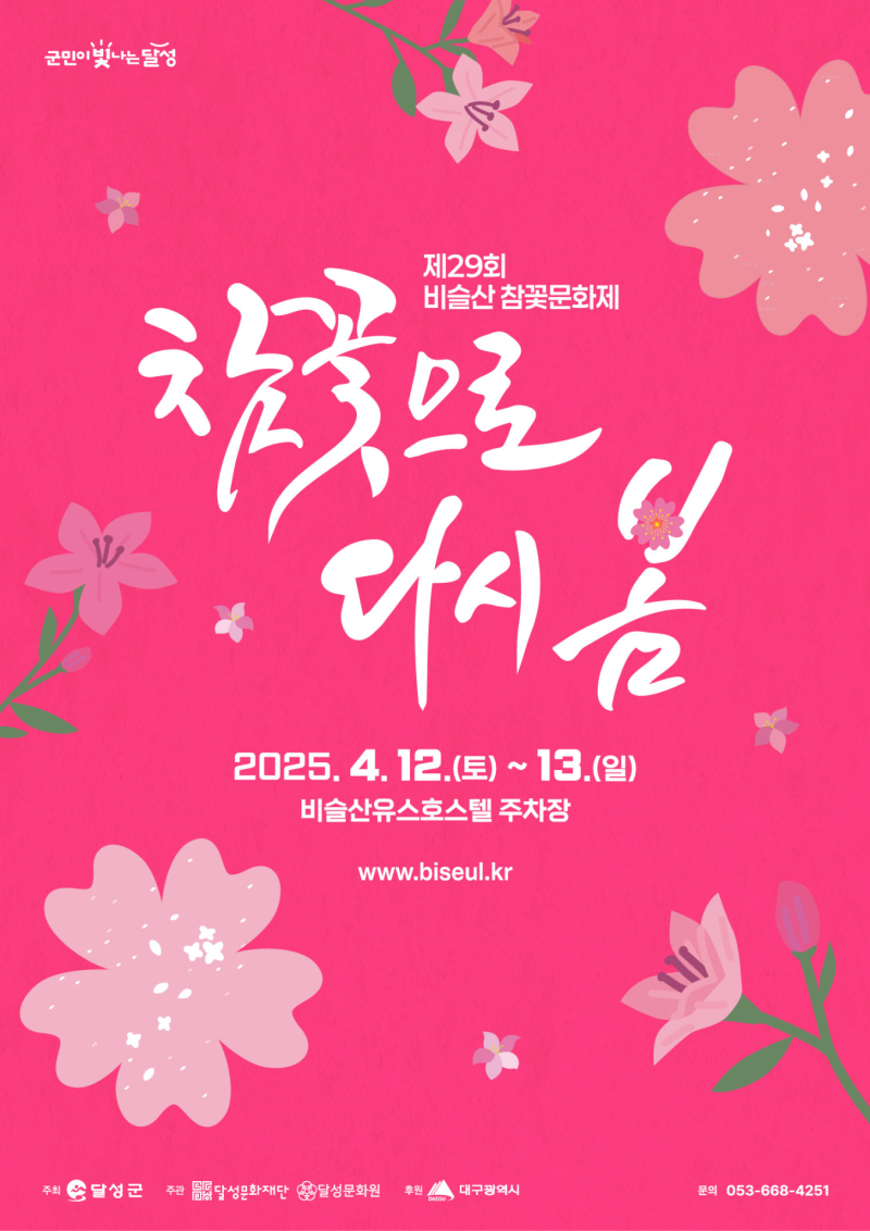 축제에 대한 자세한 사항은 비슬산 참꽃문화제 홈페이지(www.biseul.kr)에서 확인할 수 있으며, 4월 1일부터 달성군 공식유튜브를 통해 참꽃군락지를 실시간 스트리밍으로 감상할 수 있다.