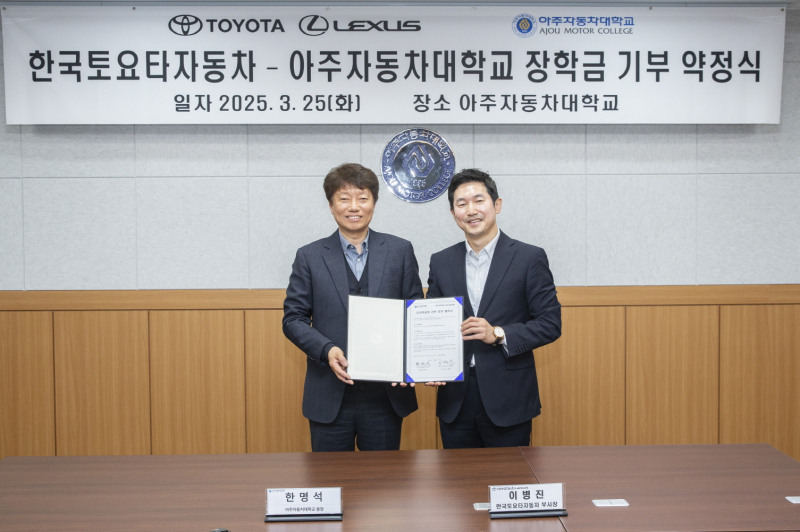 이번 장학금 전달식은 한국토요타자동차의 산학협력 교육 프로그램인 ‘T-TEP’의 일환으로, 아주자동차대학교 캠퍼스에서 이병진 한국토요타자동차 부사장, 한명석 아주자동차대학교 총장을 비롯한 약 20여 명의 관계자가 참석한 가운데 진행됐다.