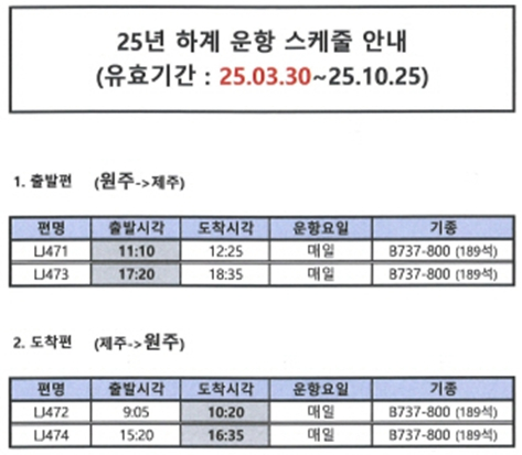 - 제주→원주(일 2편) 오전 9시 5분·오후 3시 20분