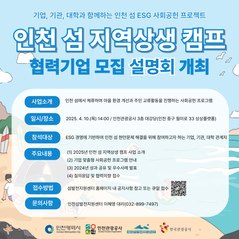 [서울경제TV 인천=김혜준 기자] 인천광역시와 인천관광공사가 ‘인천 섬 지역상생 캠프’ 협력기업 모집을 위한 설명회를 개최합니다.