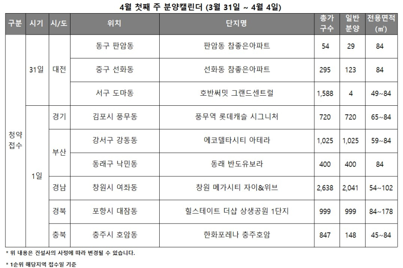 이 외에도 지방에서는 대전 서구 '호반써밋 그랜드센트럴'(조합원 취소분, 4가구), 충북 충주시 '한화포레나 충주호암'(조합원 취소분, 148가구) 등이 청약을 진행한다.