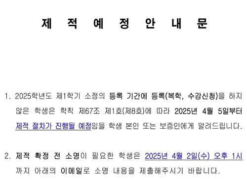제적 확정 전 소명이 필요한 학생은 내달 2일 오후 1시까지 소명 내용을 제출하라고 안내했다.