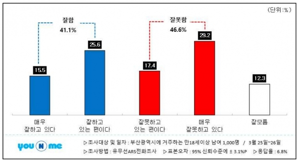 부산언론인연합회(이하 부언련)가 지난 25~26일 이틀간 여론조사기관 ㈜유앤미리서치에 의뢰해 실시한 박형준 부산시장의 시정수행평가 여론조사 결과, 부산시민 46.6%가 '잘 못하고 있다'고 평가하는 것으로 나타났다. 반면 '잘하고 있다'는 응답은 41.1%에 그쳤다.
