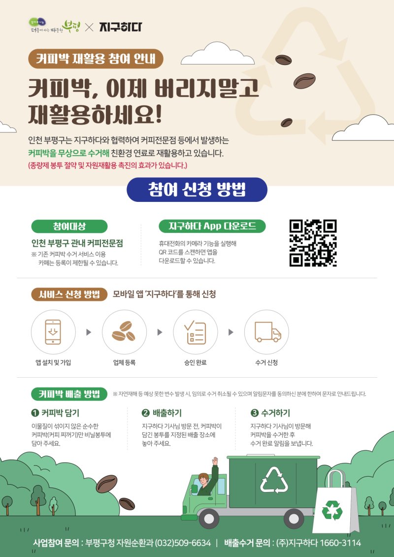 인천 부평구가 커피전문점에서 발생하는 커피박(커피찌꺼기) 재활용 시스템을 구축하고 운영에 나섭니다.