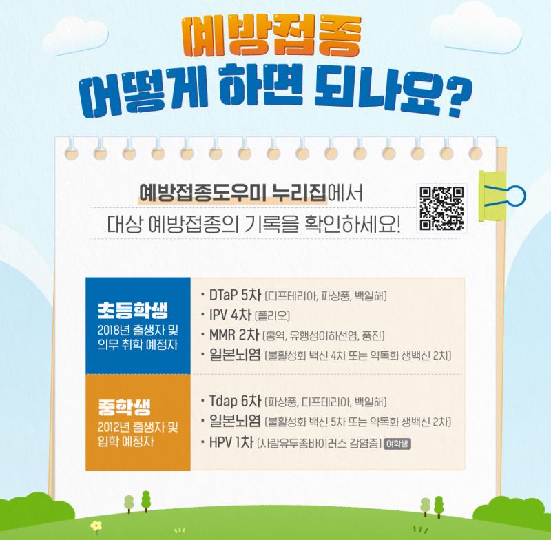 대상은 초등학교 입학생(2018년생)과 중학교 입학생(2012년생)이며, 초등학생은 DTaP, IPV, MMR, 일본뇌염 등 4종, 중학생은 Tdap, 일본뇌염, HPV(여학생 대상) 등 3종의 예방접종 여부를 점검한다고 밝혔습니다.