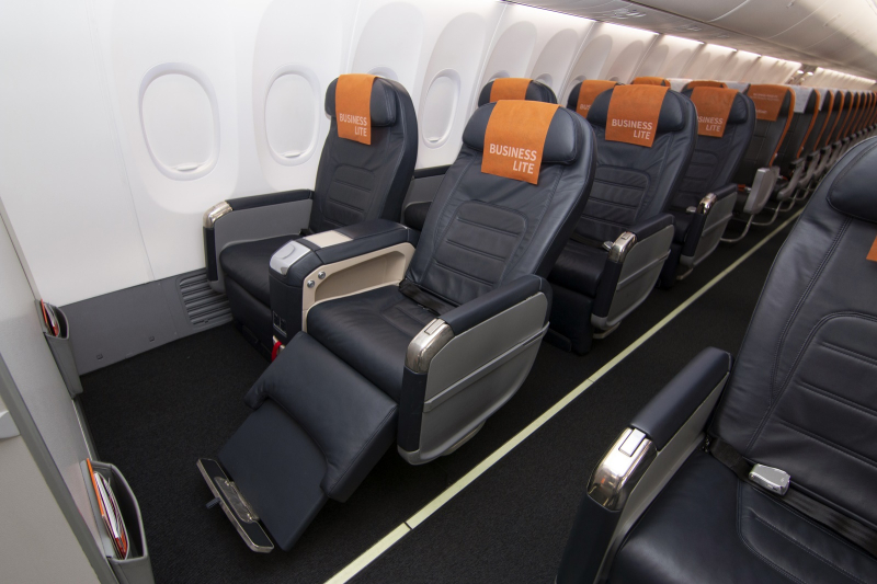 제주항공의 비즈라이트 좌석은 기존의 ‘3-3’ 형태로 배열된 좌석 일부를 ‘2-2’ 형태로 바꿔 앞·뒤 좌석 간격을 늘린 프리미엄 이코노미 좌석이다. 전용 카운터 우선 체크인, 무료 수하물 30kg, 수하물 우선처리 등의 혜택과 함께 기내식과 어메니티를 제공한다.
