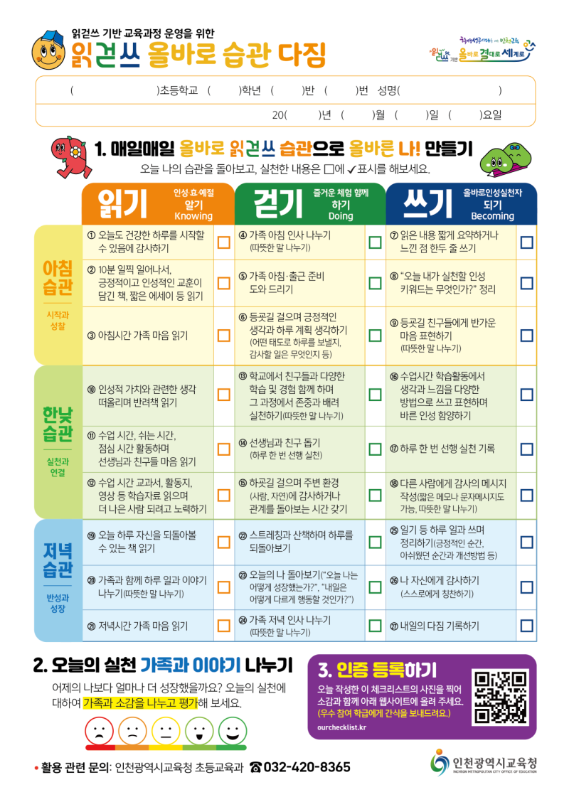 자료는 체크리스트 형태로, 학생들이 매일 자신의 생활 습관과 학습 태도를 점검하며 읽기, 걷기, 쓰기 활동을 실천할 수 있도록 구성됐습니다.