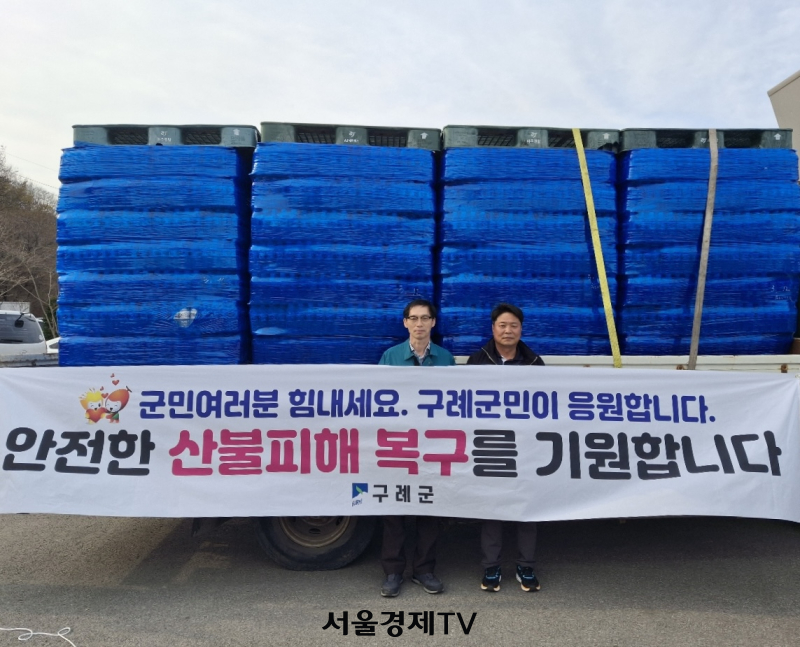 1일 구례군에 따르면 지난달 28일 대형 산불로 피해를 입은 하동군과 산청군 주민들을 돕기 위해 지역에서 생산한 생수 1000박스를 두 지역 산불방지대책본부에 전달하며 위로의 뜻을 전했다.