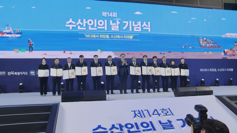 기념식에서는 수산업 발전에 기여한 유공자 12명에 대한 정부 표창이 수여됐습니다. 고창군수산업협동조합 김충 조합장과 한국김산업연합회 최봉학 회장은 각각 은탑산업훈장을 받았으며, 제주 성산리어촌계 이구순 계장은 대통령 표창을 수상했습니다.