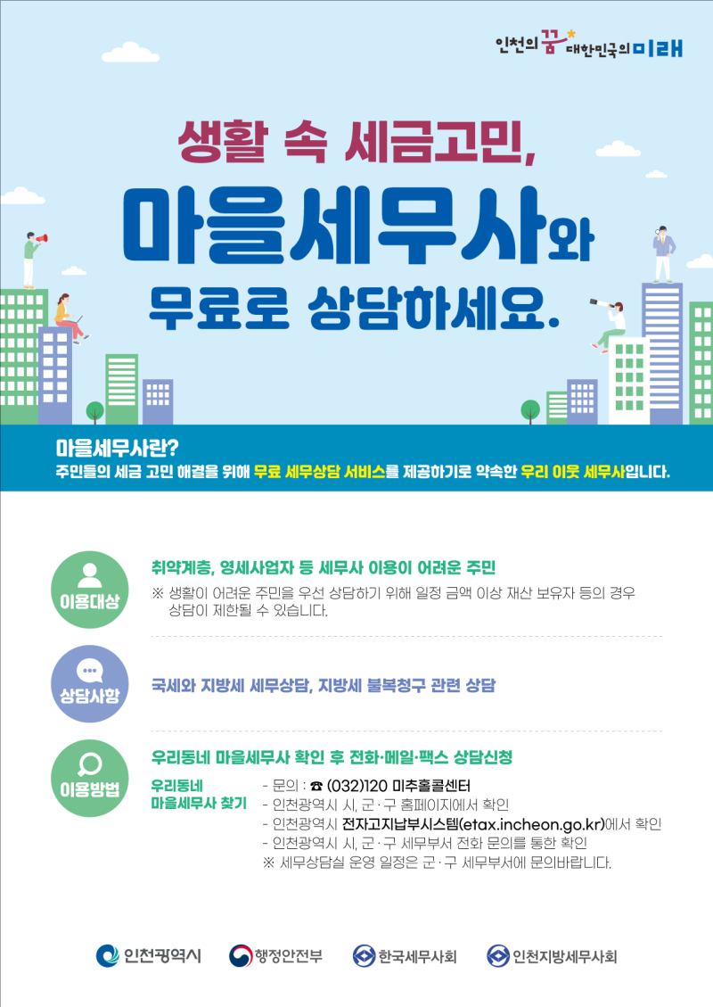 상담은 오는 4월 21일 송도4동 행정복지센터에서 오후 2시부터 5시까지 3시간 동안 진행되며, 마을세무사 최종국·이세웅 세무사가 국세 및 지방세 관련 세금 고민을 무료로 상담해 준다고 밝혔습니다.