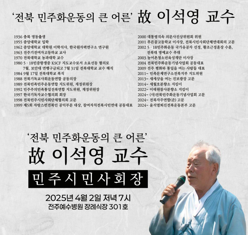 [서울경제TV 전북=이경선 기자] 계엄군의 감시와 협박 속에서도 삶 그 자체가 ‘민주화운동’이었던 이석영 전북대 명예교수(전북민주화운동기념사업회 고문)의 별세 소식이 지역 사회에 깊은 울림을 주고 있다. 향년 89세.