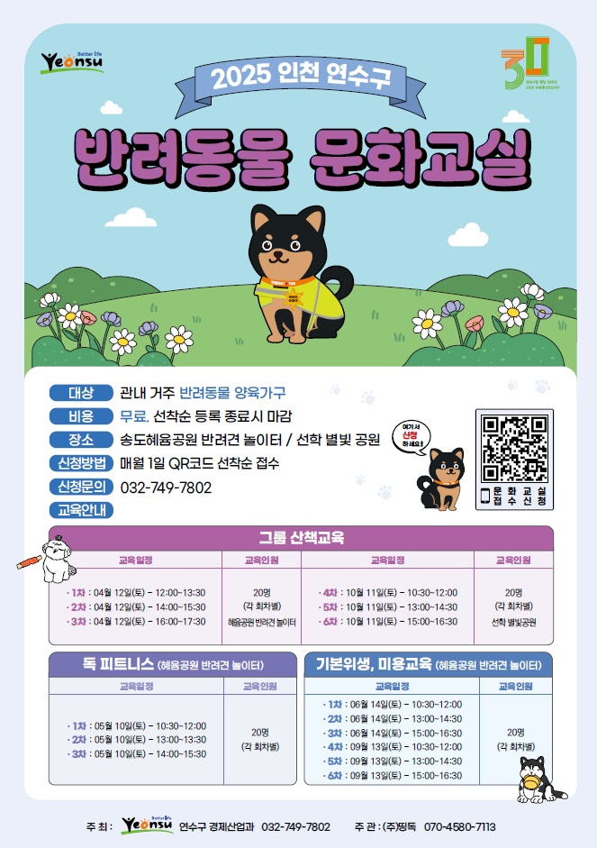 교육은 송도혜윰공원과 선학별빛공원에서 열리며, 동물등록을 완료한 구민이면 매월 1일부터 선착순으로 신청할 수 있다고 안내했습니다.