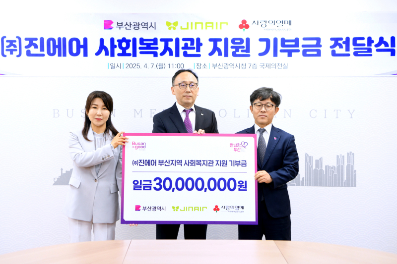 이날 부산시청에서 진행된 기부금 전달식에는 진홍 진에어 부산여객지점장과 정태기 부산시 사회복지국장, 김경희 사회복지공동모금회 사회공헌본부장 등 관계자들이 참석해 지역 복지를 위한 뜻깊은 시간을 가졌다.