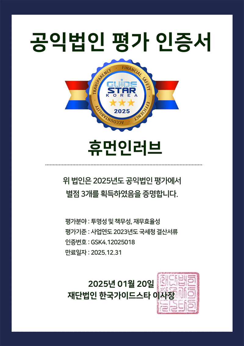 휴먼인러브, 5년 연속 공익법인 평가 최고등급 선정