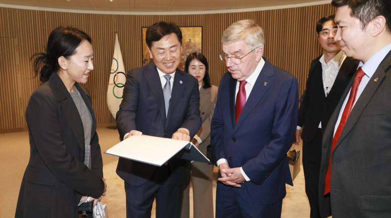 전북자치도는 김관영 도지사가 현지시간 8일 스위스 로잔에 위치한 국제올림픽위원회(IOC) 본부를 방문해 토마스 바흐 IOC 위원장과 콜린다 그라바르 키타로비치 미래유치위원장을 공식 면담했다고 9일 밝혔다. 유승민 대한체육회장도 자리를 함께했다.