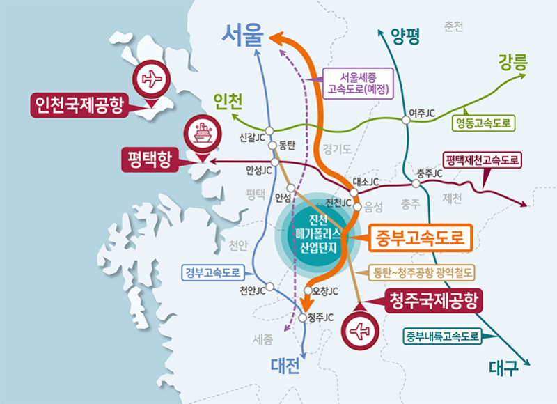 둘째, 사통팔달의 교통망이다. 진천메가폴리스 산업단지는 국토의 중심인 지리적 강점과 사통팔달의 교통망을 보유해 전국 2시간 내 생활권, 수도권1시간 내 진입이 가능한 국내 최고의 산업입지를 갖추고 있다. 실제 고속도로 3개 노선(중부·경부·평택제천고속도로)과 국도 3개 노선(17·21·34번), 고속철도(수도권내륙선(예정)·오송역 25분), 광역철도(동탄~청주공항 광역철도·청주공항 30분), 항만(평택항 70분), 항공(청주공항 10분) 등의 광역 교통망이 형성된다.
