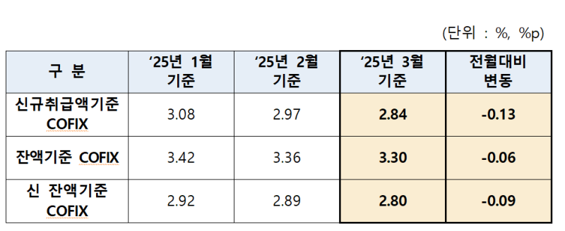 잔액기준 코픽스는 3.30%로 전달 대비 0.06%p 하락했고, 신잔액 기준 코픽스는 2.80%로 전달 대비 0.09%p 하락했다.