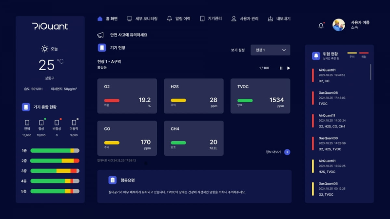 파이퀀트(PiQuant)는 인공지능(AI)과 사물인터넷(IoT) 기반의 실시간 유해가스 감지 시스템을 통해 건설업계의 안전관리 수준을 한층 높이고 있다고 16일 밝혔다. 최근에는 한국건설기술연구원과 협력해 유해가스 검사 장비의 소형화·모듈화를 실현하고 특허를 출원했으며, 중소벤처기업부의 R&D 지원과 LH 상생형 벤처지원사업을 통해 상용화를 추진하고 있다. 이 기술은 산소, 일산화탄소, 메탄, 황화수소, TVOC 등 다양한 유해가스를 실시간으로 감지할 수 있는 기능을 갖추고 있다.