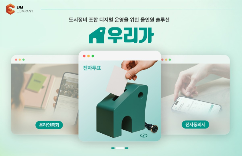 이러한 문제를 해결하기 위해 이제이엠컴퍼니는 디지털 기반 조합 운영 플랫폼 ‘우리가’를 선보였다. 이 플랫폼은 조합 설립 단계부터 해산에 이르기까지의 전 과정을 디지털화하며, 전자동의서, 전자투표, 온라인총회는 물론 행정운영 효율화 시스템과 조합원 전용 홈페이지까지 지원하는 토탈 솔루션이다.