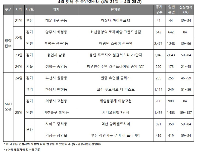 특히 올해는 수도권에서 1,000가구 넘는 대단지 공급 소식이 전무한 상황이었지만 4월 넷째 주 올해 첫 수도권 대단지 공급이 예고돼 있다.