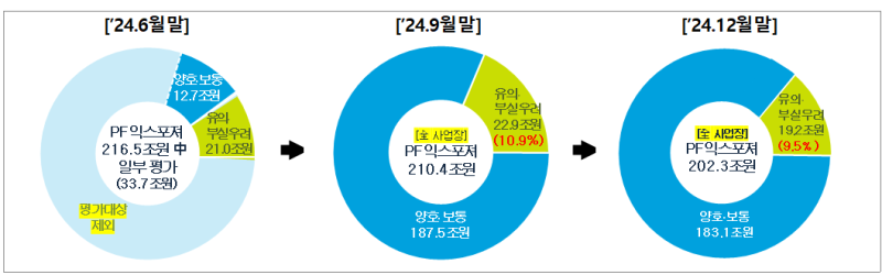 금융당국은 올해 1분기 전체 부동산PF 사업성 평가를 진행 중인데, 이달 말까지 완료한다는 계획이다. 금감원은 지난달 19일 전체 PF 사업장 사업성 평가 결과 위험노출액과 부실규모 모두 감소했다고 발표했다. 지난해 12월말 기준 전체 부동산PF 부실규모는 19조2000억원으로 9월말 22조9000억원보다 줄었다. 전체 부동산PF 위험노출액은 지난해 9월말 210조4000억원에서 12월말 기준 202조3000억원으로 감소했다고 밝혔다. 금감원은 전 금융권 PF 사업장에 대한 평가를 통해 부실 사업장을 선별하고 정보공개 플랫폼 매물정보 확대와 시장 내 자율매각 활성화를 지속적으로 유도하겠다고 밝히며, 신디케이트론 등을 통한 자금공급을 추진하겠다고 말했다. 이어, 중·대형 부실 사업장에 대한 정리 지연 사유 등을 파악해 개선을 유도하겠다고 말했지만 시장 분위기가 좋지 않다.
