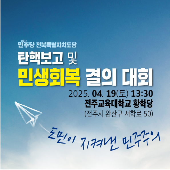 [서울경제TV 전북=이경선 기자] 더불어민주당 전북자치도당(이하 전북도당)은 지난 12일 더불어민주당 긴급의원 총회로 순연 됐던 탄핵보고 및 민생회복 결의 대회를 오는 19일 전주교육대학교 황학당(전주시 완산구 서학로 50)에서 다시 개최한다.