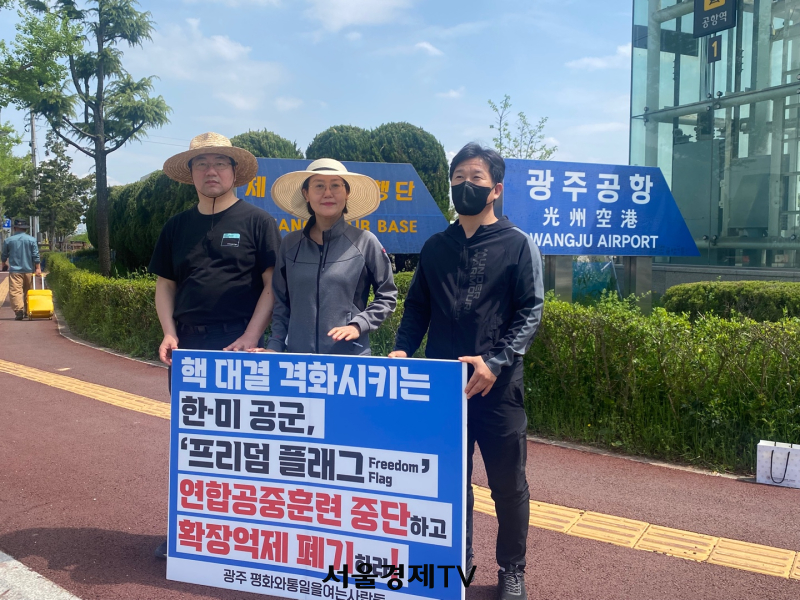 [서울경제TV 광주⋅전남=나윤상 기자] 광주 평화와 통일을 여는 사람들(광주평통사)이 한미 공군이 광주 광산구 공군 광주기지에서 열린 공군 연합공중 훈련 ‘프리덤 플래그(Freedom Flag)’ 훈련을 반대하는 1인 시위에 나섰다.
