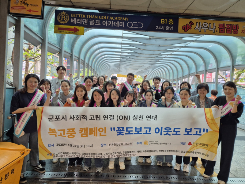 시에 따르면, 지난 4월 22일 산본역 일대에서 민·관 실천연대 ‘복·고·풍’ 주관으로 거리 홍보 캠페인이 열렸다. 군포시무한돌봄센터, 매화종합사회복지관, 행정복지센터 등 11개 기관 관계자 30여 명이 참여했다.