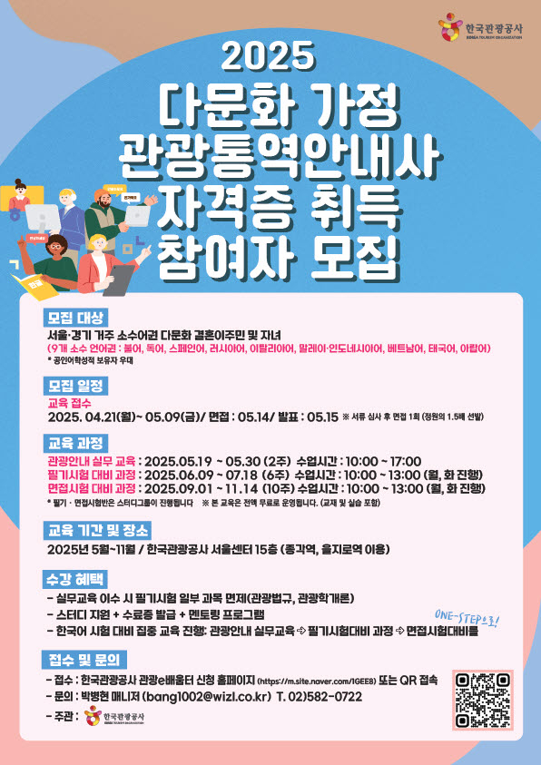 수도권에 거주하는 9개 언어권 결혼 이민자 또는 그 자녀라면 지원할 수 있으며 공인어학성적 보유자는 우대한다. 모집 기간은 오는 9일까지이며, 면접을 통해 최종 60명을 선발하여 5월 15일에 발표한다. 자세한 내용은 공사 관광교육 통합 누리집 관광e배움터(touredu.visitkorea.or.kr)에서 확인할 수 있다.