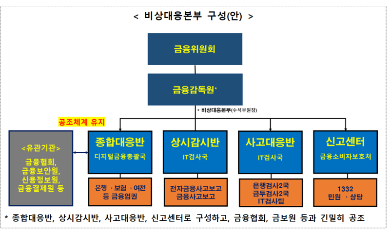 금융감독원은 “유관기관·금융협회 등과 긴밀한 공조를 통해 금융권 대응현황 및 이슈를 신속히 파악하는 한편, 부정·사기거래 등의 금융사고에 대비해 사고보고체계를 강화하고 일일 모니터링을 실시하고 있으며, 금융사고 전담 신고센터(☎1332) 운영 등을 통해 금융소비자 피해 예방에 최선을 다하고 있다”고 말했다.