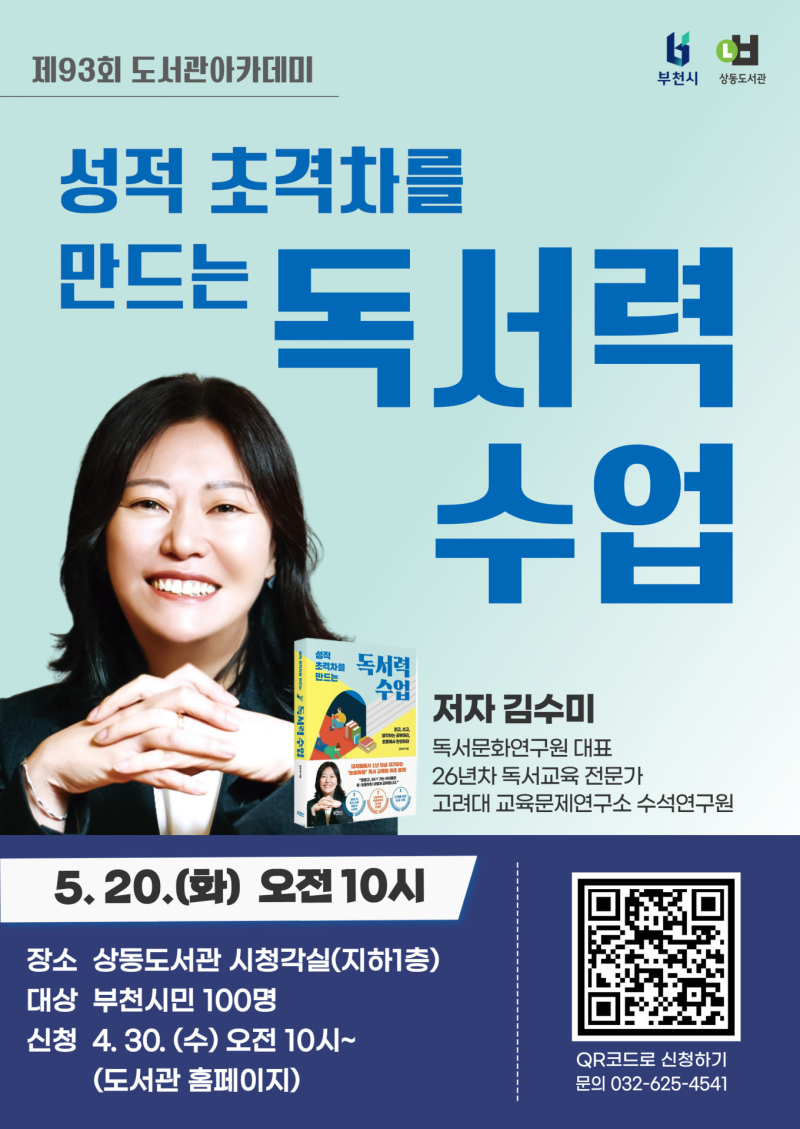 시에 따르면 상동도서관은 오는 5월 20일 오전 10시, 제93회 도서관 아카데미로 『성적 초격차를 만드는 독서력 수업』의 저자 김수미 작가를 초청해 학부모 대상 특강을 연다고 밝혔습니다.