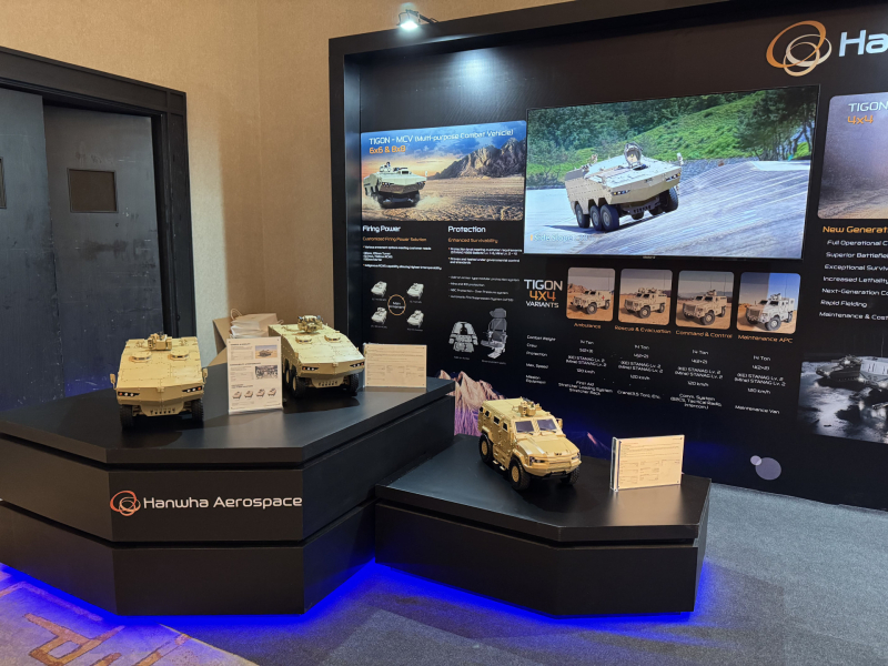 칠레 육군의 차륜형 장갑차 사업(Cromo 프로젝트) 참여를 준비 중인 한화에어로스페이스는 독자 개발한 ‘타이곤 차륜형 장갑차’를 전시해 우수한 성능과 품질, 빠른 납기와 안정적인 후속 군수지원 등을 강조했다.