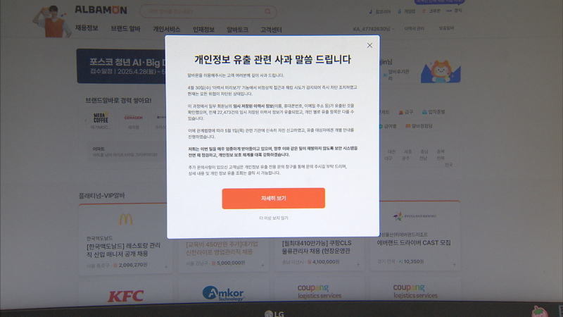 다만 아이디와 비밀번호 등 계정 관련 정보는 유출되지 않았다고 알바몬은 덧붙였습니다.