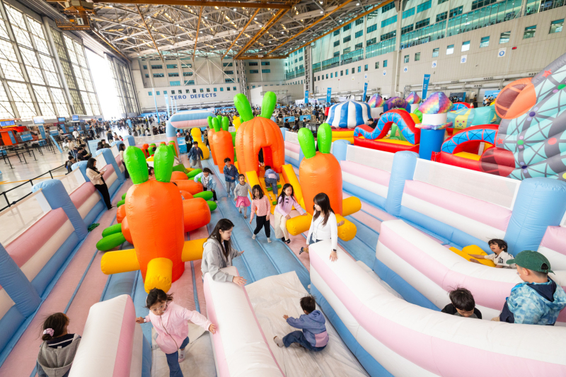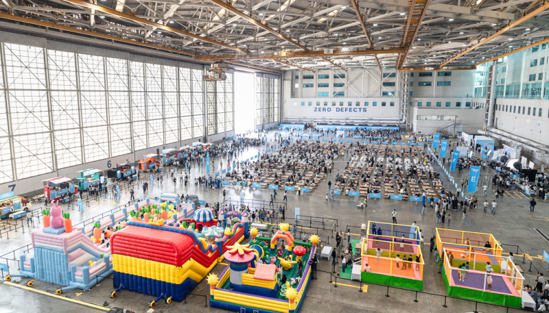 이번 격납고 행사는 가족들과 즐거운 추억을 남길 수 있는 다양한 프로그램들로 구성됐다. 테마파크로 꾸며진 격납고에는 어린이용 놀이기구와 우리가족 사진관, 모닝캄 포토부스, 패밀리사원증 키오스크, 벌룬아트, 페이스페인팅, 푸드트럭 등 가족들을 위한 대형 놀이공간과 즐길거리가 마련됐다.