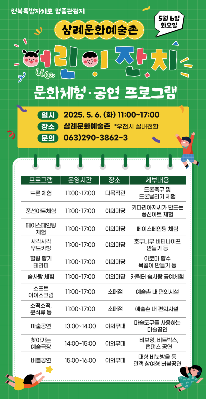 또한 △드론축구 △솜사탕 꾸미기 △페이스페인팅 △키다리 아저씨와 풍선아트 △사각사각 우드카빙 △힐링아로마테라피 △글라스아트체험 △유리티코스터 만들기 △대한민국응급처치협회전북본부와 함께하는 어린이 응급처치 체험 등 온 가족이 함께 즐길 수 있는 다양한 체험 코너도 마련된다.