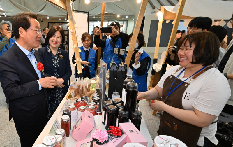 이날 행사에는 다양한 제품들이 전시되었으며, 유 시장은 판매 물품을 살펴보며 관계자들을 격려했다고 밝혔습니다./hyejunkim42@sedaily.com