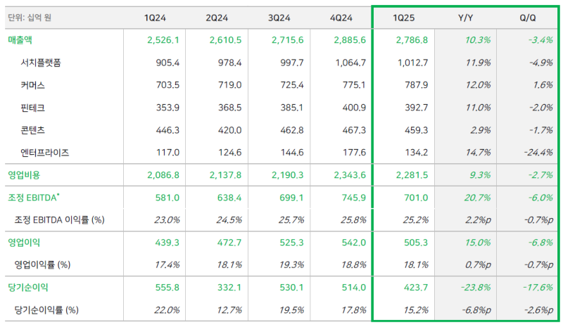 사업 부문별 매출액은 서치플랫폼 1조127억 원, 커머스 7879억 원, 핀테크 3927억 원, 콘텐츠 4593억 원, 엔터프라이즈 1342억 원이다.