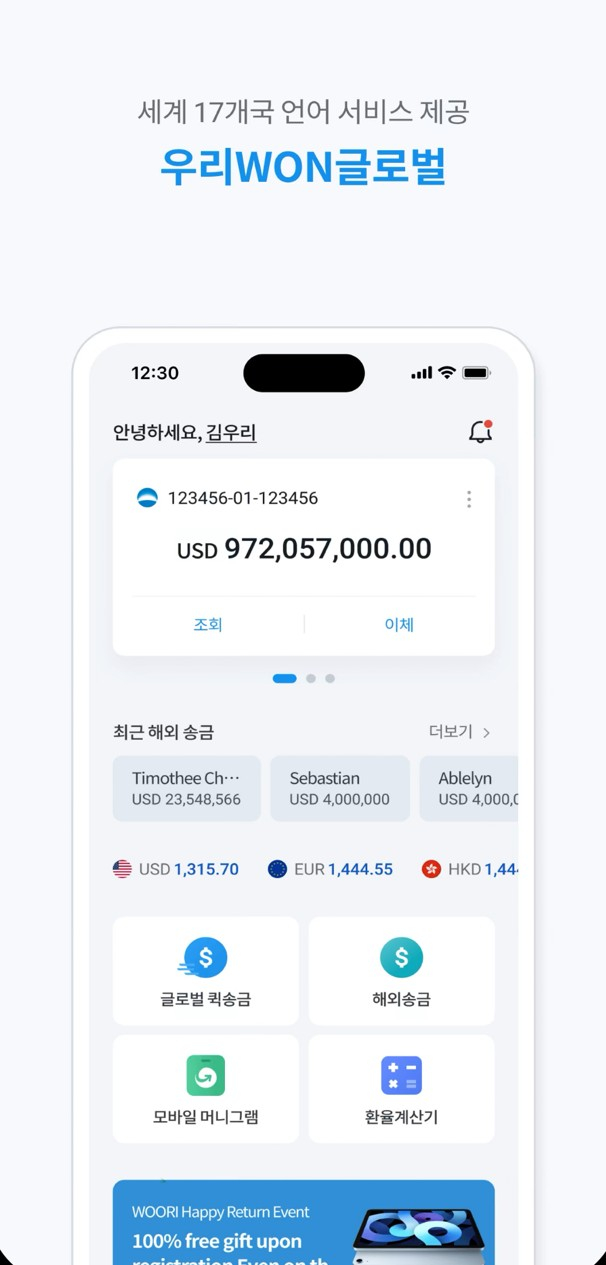이 밖에도 외국인 고객 전용 앱인 ‘우리WON글로벌’ 개편을 통해 비대면 계좌 개설, 해외송금 등 금융서비스와 생활 편의 서비스를 17개 언어로 제공하는 토탈 플랫폼으로 거듭난다는 방침이다. 향후에는 한국어 교육 컨텐츠와 한국어능력시험(TOPIK) 모의고사 기능도 제공할 계획이다.