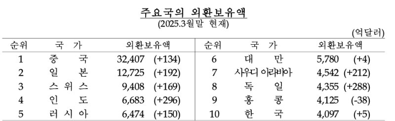 3월 말 기준 우리나라의 외환보유액 규모는 세계 10위 수준을 기록했다. 우리나라 외환보유액 규모는 2023년 8월부터 올해 2월까지 9위를 유지했지만, 3월 한 단계 떨어졌다. 국가별로 보면 중국이 3조2407억달러로 세계 1위 자리를 지켰고, 일본 1조2725억달러, 스위스 9408억달러, 인도 6683억달러, 러시아 6474억달러, 대만 5780억달러, 사우디아라비아 4542억달러, 독일 4355억달러, 홍콩 4125억달러 순을 기록했다. / yalee@sedaily.com