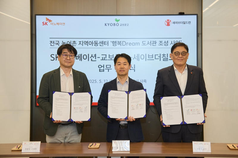 SK이노베이션은 지난해 시작한 이 사업을 확대하기 위해 12일 서울 종로구 SK서린빌딩에서 교보문고, 국제아동권리 비영리 시민 단체 세이브더칠드런과 업무협약을 맺었다. 3개 기관은 농어촌 지역의 교육 인프라 확충에 기여하고 지역 아동들이 독서를 일상화 할 수 있도록 돕기 위해 뜻을 모았다.