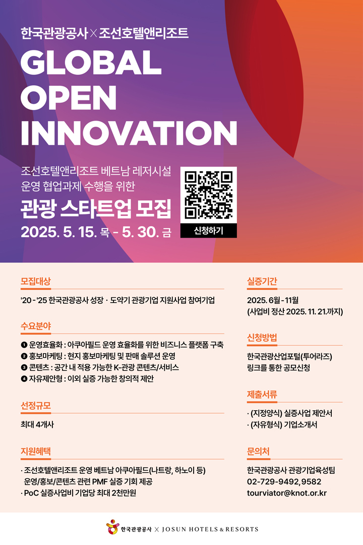 - 사업 운영․홍보마케팅․K-관광콘텐츠 분야 등 관광기업 최대 4개사 공모(~5.30) -