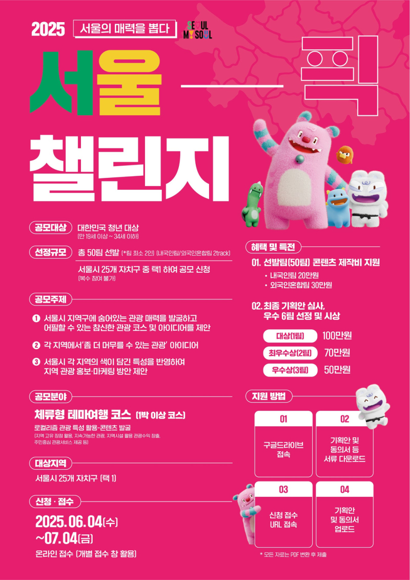 [서울경제TV=김수윤 인턴기자] 서울시는 6월 4일부터 7월 4일까지 ‘서울픽(Seoul Pick) 챌린지’ 공모전을 개최하고 25개 자치구를 대상으로 한 지역관광 전문 컨설팅을 함께 진행한다고 23일 밝혔다.