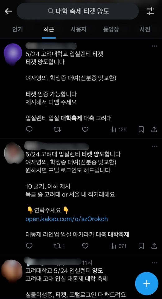 작년 축제 담당자였던 한 총학생회 관계자는 축제 준비를 하면서 가장 힘들었던 점을 취재진에게 이렇게 털어놓았다. 학생증과 민증, 학교 아이디까지 총동원해서 신분확인을 진행하지만, 거래자가 서로 만나 해당 정보를 모두 양도하고, 추후 다시 돌려주는 방식을 사용해버리면, 관계자 역시 막아낼 도리가 없다는 것. 축제 시즌만 되면 각 인터넷 커뮤니티에 ‘대학 축제 티켓 양도’글이 하루에도 수십 개씩 올라왔다.