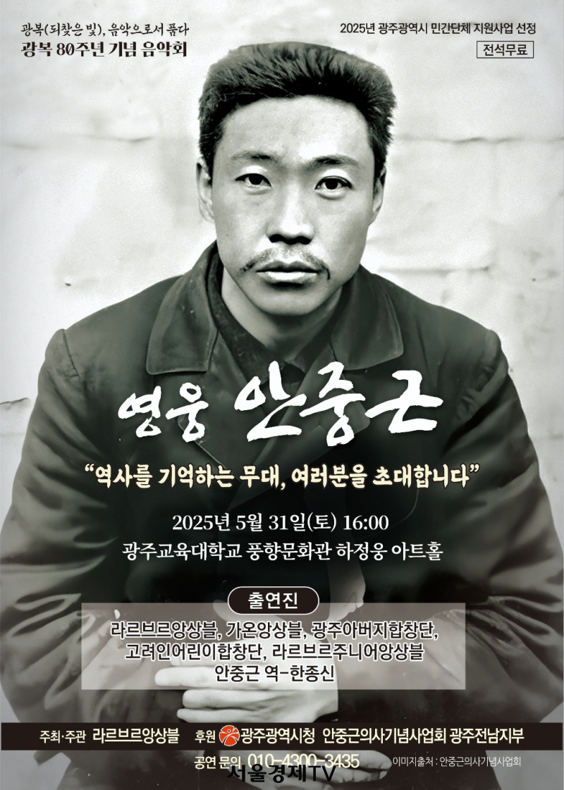 [서울경제TV 광주⋅전남=나윤상 기자] 광복 80주년을 앞두고 오는 31일 광주교육대학교 풍향문화관 하정웅 아트홀에서 '광복(되찾은 빛), 음악으로서 품다 광복 80주년 기념 음악회 영웅 안중근'이 개최된다.