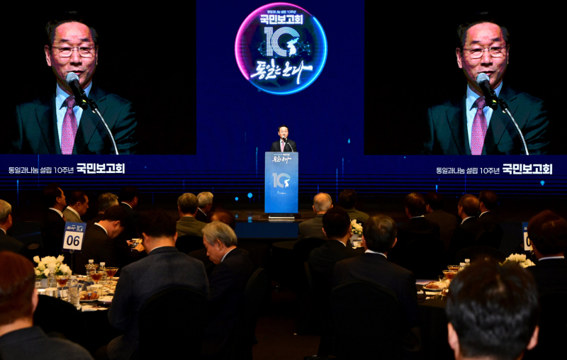 유정복 인천광역시장이 26일 서울 대한상공회의소에서 열린 '통일과 나눔 설립 10주년 국민보고회'에서 축사를 하고 있다./hyejunkim42@sedaily.com