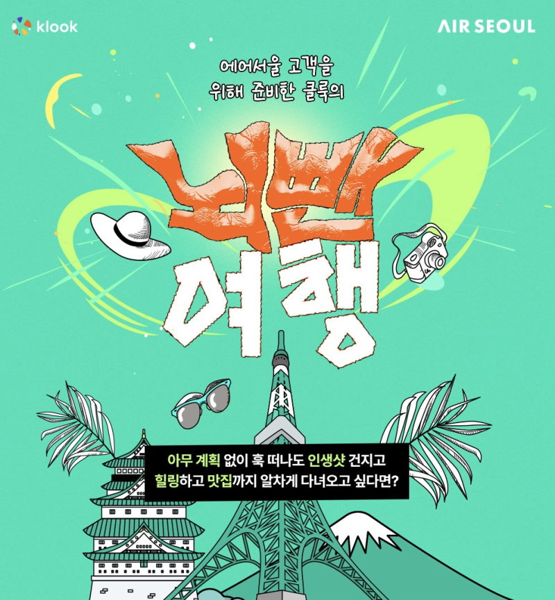 ‘클룩으로 뇌뺀여행’ 캠페인은 다가오는 휴가 시즌을 준비하며 계획 짜기가 어려운 고객들을 위해 클룩이 여행 코스 및 일정을 추천하고, 여행 상품을 할인하는 프로모션이다. 에어서울은 이 캠페인에 참여해 항공권 할인을 제공함으로써 고객이 보다 합리적으로 여행할 수 있도록 지원한다.