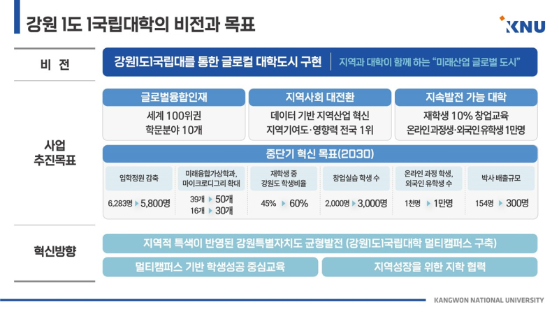 강원대학교는 이번 통합을 통해 국비 1720억원, 지방비 430억원 등 총 2,150억원 규모의 글로컬대학30 사업비를 확보했으며, 이를 바탕으로 교육혁신, 지역특화 연구, 산학협력, 국제화 등 대학의 전 영역에서 지속가능한 성장을 추진해 나가고 있다. 통합 강원대학교는 2026년 3월 공식 출범을 목표로 하고 있으며, 교명은 ‘강원대학교’를 유지하고 총장은 현 정재연 강원대학교 총장이 맡게 된다.