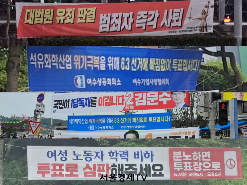 해당 현수막에는 '석유화학산업 위기극복을 위해 6.3 선거에 꼭 투표합시다'라는 문구가 적혀 있으며, 주말인 오늘까지도 여전히 도심 곳곳에 걸려 있다.