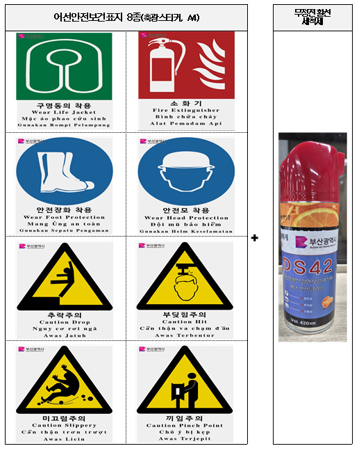 어선안전보건표지는 선내 작업 공간에 부착해 어선원의 안전 경각심을 강화하고, 무정전 활선 세척제는 먼지 등으로 인한 어선 화재 사고를 예방하는 데 사용할 수 있다.