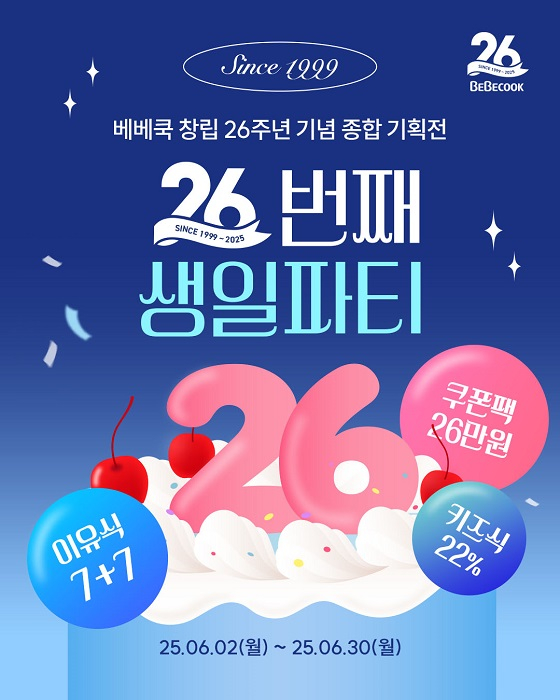 [서울경제TV=고원희 인턴기자] 영유아 식품 전문 브랜드 베베쿡은 창립 26주년 맞아 6월 한 달 동안 홈페이지와 네이버 스마트스토어에서 특별 기획전을 진행한다고 4일 밝혔다.